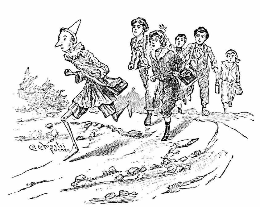 1940 saw the release of Disney's Pinocchio, its second full-length animated feature film after Snow White and the Seven Dwarves (1937). While Disney's version saw Pinocchio as naive, the original by Carlo Lorenzini seemed to be a troublemaker from the beginning. As soon as Pinocchio can walk, he runs away into town, where he is found by a policeman who assumes Geppetto has abused Pinocchio. After this, Geppetto is wrongfully thrown into prison. Jiminy Cricket shows up and warns Pinocchio about being untruthful. Pinocchio then throws a hammer at the cricket and kills him. Geppetto is released from prison and convinces Pinocchio to attend school and sells his only coat to buy Pinocchio schoolbooks. The next day, Pinocchio sets off, ditching school. He sells the schoolbooks and buys tickets to the Grand Marionette Theater. A blue fairy promises to turn Pinocchio into a real boy if he begins to behave.