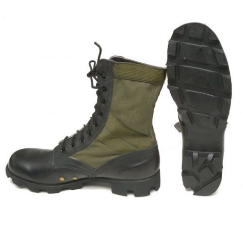 In 1965, the black leather boots were phased out in favor of jungle boots for the Vietnamese jungle conditions. They were made to handle the mud and moisture of the climate and could drain water and resist mildew. This type of breathable, waterproof boot was first discovered during the Pacific Theater of World War II. That’s why everyone in Vietnam would have been wearing these jungle boots, not the black leather boots as seen in the movie.