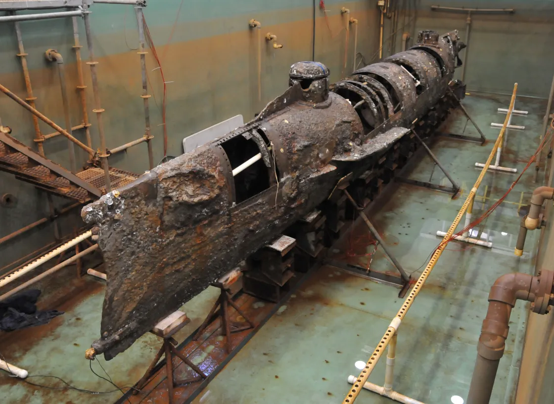 Many hours of archaeological research began right after the wreck was given to the conservation center. The crew were still inside the submarine's wreck, and they were removed and identified with DNA testing. Their remains were buried at the Magnolia Cemetery in Charleston. Among the thousands of attendees were reenactors and color guards from all five branches of the military. Today, you can see what remains of the HL Hunley at the Warren Lasch Conservation Center in North Charleston, South Carolina. The exhibit also includes a replica that visitors can enter.